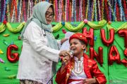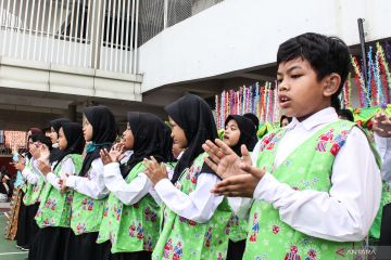 Sejumlah siswa berkebutuhan khusus tampil pada pentas peringatan Hari Guru Nasional di Sekolah Luar Biasa Negeri 3 Tanah Abang, Jakarta, Jumat (25/11/2022). Peringatan Hari Guru Nasional yang mulai dilakukan sejak 1994 sebagai penghormatan kepada guru se-Indonesia tersebut pada tahun ini mengangkat tema "Serentak Berinovasi, Wujudkan Merdeka Belajar". ANTARA FOTO/Darryl Ramadhan/hp.