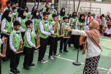 Sejumlah siswa berkebutuhan khusus bermain angklung saat peringatan Hari Guru Nasional di Sekolah Luar Biasa Negeri 3 Tanah Abang, Jakarta, Jumat (25/11/2022). Peringatan Hari Guru Nasional yang mulai dilakukan sejak 1994 sebagai penghormatan kepada guru se-Indonesia tersebut pada tahun ini mengangkat tema "Serentak Berinovasi, Wujudkan Merdeka Belajar". ANTARA FOTO/Darryl Ramadhan/hp.