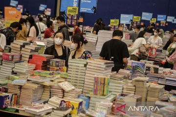 Pengunjung memilih buku yang dijual dalam bazar buku Big Bad Wolf 2022 di ICE BSD, Tangerang, Banten, Minggu (27/11/2022). Pameran yang berlangsung hingga 5 Desember 2022 tersebut menghadirkan 50.000 judul buku baru dengan tujuan meningkatkan literasi serta budaya gemar membaca masyarakat. ANTARA FOTO/Fauzan/aww.