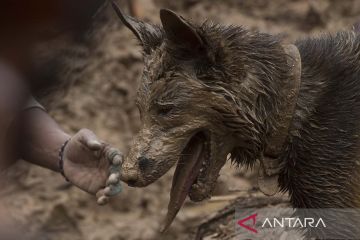Personel Polri mengerahkan anjing pelacak untuk mencari korban yang tertimbun longsor akibat gempa di Kampung Cijedil, Cugenang, Kabupaten Cianjur, Jawa Barat, Minggu (27/11/2022). Tim SAR gabungan kembali menemukan tiga korban sehingga menjadi 321 korban meninggal dan 11 orang belum ditemukan. ANTARA FOTO/Wahyu Putro A/aww.