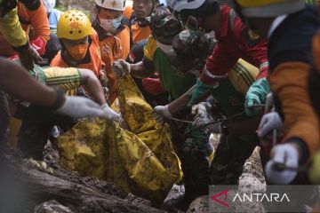 Tim SAR gabungan membawa kantong berisi jenazah korban yang tertimbun longsor akibat gempa di Kampung Cijedil, Cugenang, Kabupaten Cianjur, Jawa Barat, Minggu (27/11/2022). Tim SAR gabungan kembali menemukan tiga korban sehingga menjadi 321 korban meninggal dan 11 orang belum ditemukan. ANTARA FOTO/Wahyu Putro A/aww.