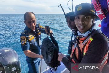 Tim SAR gabungan menunjukkan tas milik salah satu korban helikopter milik Polri NBO-105 yang jatuh di perairan Manggar, Belitung Timur, Kepulauan Bangka Belitung, Senin (28/11/2022). Tim SAR gabungan berhasil menemukan serpihan helikopter NBO-105 Polri dan mengevakuasi satu jenazah korban yang merupakan mekanik helikopter tersebut. ANTARA FOTO/Dok Kantor SAR Pangkal Pinang/Handout/rwa.