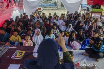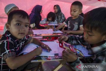 Sejumlah anak-anak penyintas gempa Cianjur mengikuti kegiatan pendidikan di posko pengungsian Lapangan Cariu, Cugenang, Cianjur, Jawa Barat, Rabu (30/11/2022). Tim relawan di posko tersebut mulai memberikan pendidikan seni dan agama secara bertahap kepada penyintas anak agar mampu kembali bangkit pascagempa bumi Cianjur. ANTARA FOTO/Novrian Arbi/wsj.