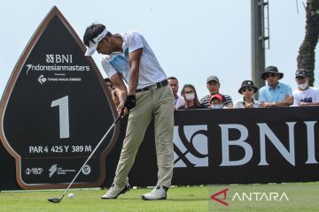 Pegolf Indonesia Kevin Akbar melakukan pukulan tee off pada hole 1 saat putaran ketiga BNI Indonesian Masters 2022 di Royale Jakarta Golf Club, Jakarta, Sabtu (3/12/2022). Kevin Akbar menjadi satu-satunya pegolf Indonesia yang berhasil lolos cut dan bertanding dengan 69 pegolf untuk merebutkan hadiah sebesar 1,5 juta dolar AS. ANTARA FOTO/Asprilla Dwi Adha/pras.