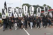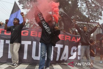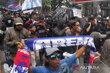 Suporter Arema FC (Aremania) melakukan longmarch dan memblokir jalan saat berunjuk rasa di perempatan jalan Ciliwung, Malang, Jawa Timur, Minggu (4/12/2022). Unjuk rasa dengan memblokir jalan selama dua jam yang dilakukan Aremania di sejumlah titik di Kota Malang tersebut merupakan bentuk protes terhadap aparat penegak hukum atas penanganan kasus Tragedi Kanjuruhan yang dinilai jalan di tempat. ANTARA FOTO/Ari Bowo Sucipto/aww.