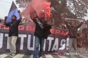 Suporter Arema FC (Aremania) menyalakan api suar (flare) saat berunjuk rasa dan memblokir jalan di perempatan jalan Ciliwung, Malang, Jawa Timur, Minggu (4/12/2022). Unjuk rasa dengan memblokir jalan selama dua jam yang dilakukan Aremania di sejumlah titik di Kota Malang tersebut merupakan bentuk protes terhadap aparat penegak hukum atas penanganan kasus Tragedi Kanjuruhan yang dinilai jalan di tempat. ANTARA FOTO/Ari Bowo Sucipto/aww.