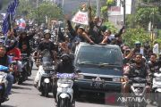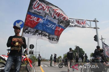 Sejumlah suporter Arema FC (Aremania) melakukan konvoi dan memblokade pintu keluar jalan tol di Singosari, Malang, Jawa Timur, Kamis (8/12/2022). Aksi blokade pintu keluar tol selama 135 menit tersebut merupakan bentuk protes terhadap aparat penegak hukum yang dinilai lambat dalam penanganan kasus tragedi Kanjuruhan. ANTARA FOTO/Ari Bowo Sucipto/pras.