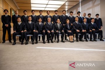 Perdana Menteri Jepang Fumio Kishida berfoto bersama pemain dan official timnas Jepang di Piala Dunia 2022 di Tokyo, Kamis (8/12/2022). ANTARA FOTO/Philip FONG/Pool via REUTERS/pras.