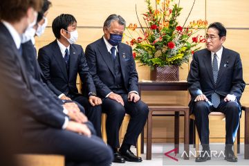 Perdana Menteri Jepang Fumio Kishida (kanan) menerima pemain dan official timnas Jepang di Piala Dunia 2022 di Tokyo, Kamis (8/12/2022). ANTARA FOTO/Philip FONG/Pool via REUTERS/pras.