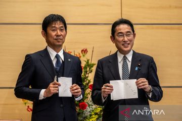 Perdana Menteri Jepang Fumio Kishida (kanan) berfoto bersama pelatih timnas Jepang Hajime Moriyasu (kiri) saat menerima pemain dan official timnas Jepang di Piala Dunia 2022 di Tokyo, Kamis (8/12/2022). ANTARA FOTO/Philip FONG/Pool via REUTERS/pras.
