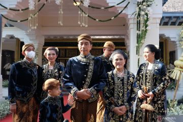 Presiden Joko Widodo (tengah) didampingi Ibu Negara Iriana Joko Widodo (ketiga kanan) dan keluarga memberikan keterangan pers saat acara Ngunduh Mantu pernikahan putra bungsunya Kaesang Pangarep dan istrinya Erina Gudono di Loji Gandrung Solo, Jawa Tengah, Minggu (11/12/2022). Acara Ngunduh Mantu pernikahan putra presiden tersebut juga diisi dengan kirab budaya dan pesta rakyat. ANTARA FOTO/Maulana Surya/hp.