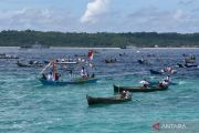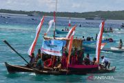 Sejumlah perahu nelayan dan warga berparade pada acara puncak peringatan Hari Nusantara di Marina Togo Mowondu, Pulau Wangi-Wangi, Wakatobi, Sulawesi Tenggara, Selasa (13/12/2022). Puncak peringatan Hari Nusantara tersebut diisi dengan atraksi Sailing Pass KRI, parade 1000 perahu, aksi Terjun Payung, atraksi Flying Pass Sukhoi, serta pagelaran tari kolosal. ANTARA FOTO/Indrianto Eko Suwarso/foc.
