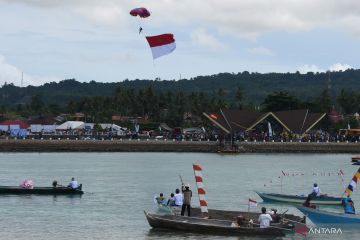 Prajurit TNI melakukan aksi terjun payung pada acara puncak peringatan Hari Nusantara di Marina Togo Mowondu, Pulau Wangi-Wangi, Wakatobi, Sulawesi Tenggara, Selasa (13/12/2022). Puncak peringatan Hari Nusantara tersebut diisi dengan atraksi Sailing Pass KRI, parade 1000 perahu, aksi Terjun Payung, atraksi Flying Pass Sukhoi, serta pagelaran tari kolosal. ANTARA FOTO/Indrianto Eko Suwarso/foc.