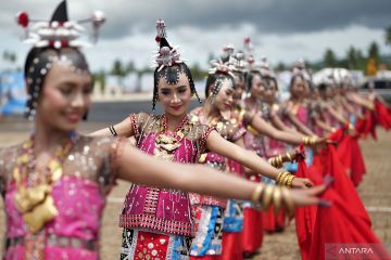 Sejumlah penari menampilkan Tari Lariangi saat puncak peringatan Hari Nusantara 2022 di Lapangan Marina di Kabupaten Wakatobi, Sulawesi Tenggara, Selasa (13/12/2022). Tari Lariangi berasal dari Kaledupa Kepulauan Wakatobi dan tari tersebut bermula sebagai tarian persembahan yang ditujukan kepada raja pada masa Kesultanan Buton. ANTARA FOTO/Jojon/foc.