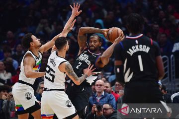 Pebasket Los Angeles Clippers Kawhi Leonard (2) menguasai bola dengan dikawal pebasket Minnesota Timberwolves Bryn Forbes (10) dan Austin Rivers (25) pada pertandingan NBA di Crypto.com , Los Angeles, California, AS (14/12/2022). ANTARA FOTO/Gary A. Vasquez-USA TODAY Sports via Reuters/aww.