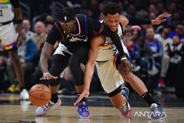 Pebasket Los Angeles Clippers Reggie Jackson (1) berebut bola dengan pebasket Minnesota Timberwolves Wendell Moore Jr. (7) pada pertandingan NBA di Crypto.com , Los Angeles, California, AS (14/12/2022). ANTARA FOTO/Gary A. Vasquez-USA TODAY Sports via Reuters/aww.