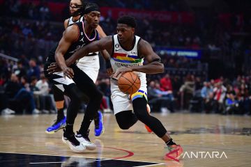 Pebasket Minnesota Timberwolves Anthony Edwards (1) mencoba melewati hadangan pebasket Los Angeles Clippers Terance Mann (14) pada pertandingan NBA di Crypto.com , Los Angeles, California, AS (14/12/2022). ANTARA FOTO/Gary A. Vasquez-USA TODAY Sports via Reuters/aww.