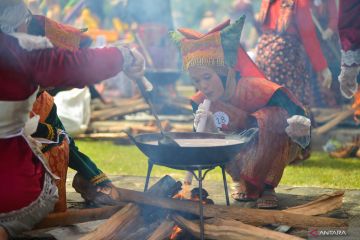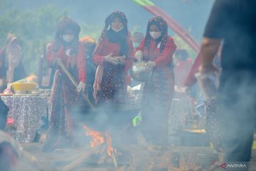 Seorang siswi menghembus api untuk memasak randang saat kompetisi Gadih Marandang, di Linggai Park, Kabupaten Agam, Sumatera Barat, Minggu (18/12/2022). Kompetisi memasak randang tersebut diikuti sejumlah siswi dari kabupaten/kota di Sumbar dalam rangka memperkenalkan cara pembuatan randang kepada anak gadis Minangkabau. ANTARA FOTO/Iggoy el Fitra/foc.