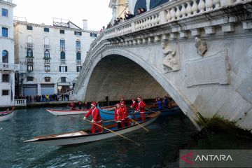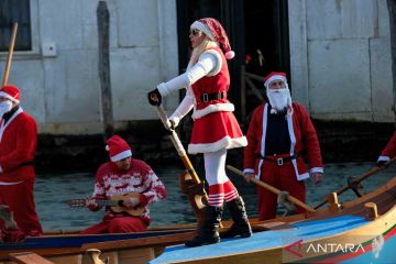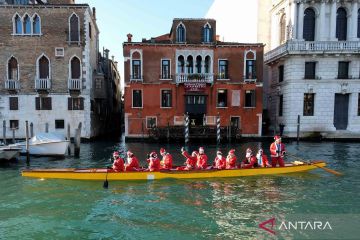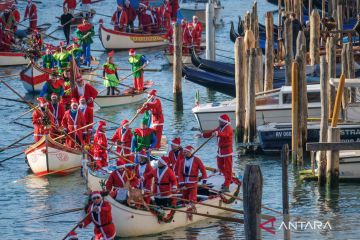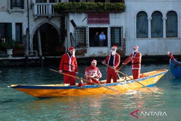 Warga berpakaian Sinterklas mendayung gondolanya saat berpartisipasi dalam acara perayaan natal di sepanjang Grand Canal di Kota Venesia, Italia, Minggu (18/12/2022). ANTARA FOTO/REUTERS/Manuel Silvestri/wsj.