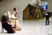 Paus Fransiskus menghadiri pertemuan dengan para eksekutif dan delegasi Konfederasi Umum Buruh Italia (CGIL) di Vatikan, Senin (19/12/2022). ANTARA FOTO/HO via Reuters-Vatican Media/hp.