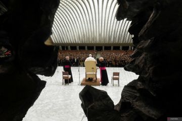 Paus Fransiskus lmendengarkan seseorang saat pertemuan dengan para eksekutif dan delegasi Konfederasi Umum Tenaga Kerja Italia (CGIL), di Vatikan, Senin (19/12/2022). ANTARA FOTO/HO via Reuters-Vatican Media/hp.