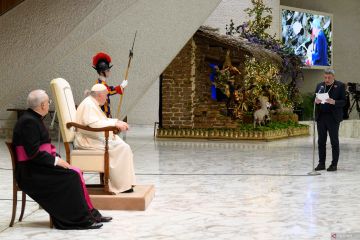 Paus Fransiskus lmendengarkan laporan saat pertemuan dengan para eksekutif dan delegasi Konfederasi Umum Tenaga Kerja Italia (CGIL), di Vatikan, Senin (19/12/2022). ANTARA FOTO/HO via Reuters-Vatican Media/hp.