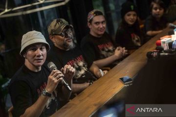 Pemain Film Bayi Ajaib Vino G Bastian (kiri) didampingi sutradara Film Bayi Ajaib Rako Prijanto (kedua kiri), dan pemain film lainya Adipati Dolken (ketiga kiri), Sara Fajira (keempat kiri) dan Rayhan Cornelius V (kelima kiri) berbicara dalam acara Media Gathering Film Bayi Ajaib di Jakarta, Rabu (21/12/2022). Film Bayi Ajaib merupakan film debut perdana dari rumah produksi Falcon Black yang disutradarai oleh Rako Prijanto dan akan tayang di bioskop pada 19 Januari 2023. ANTARA FOTO/Aprillio Akbar/wsj.