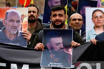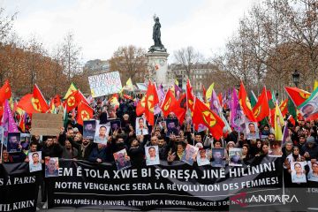 Sejumlah anggota Komunitas Kurdi berunjuk rasa memprotes penembakan kepada anggotanya di Kota Paris, Prancis, Sabtu (24/12/2022). Unjuk rasa yang terjadi menyusul tewasnya tiga orang anggota Komunitas Kurdi oleh orang tidak dikenal tersebut berakhir bentrokan pengunjuk rasa dengan aparat kepolisian. ANTARA FOTO/REUTERS/Sarah Meyssonnier/wsj.