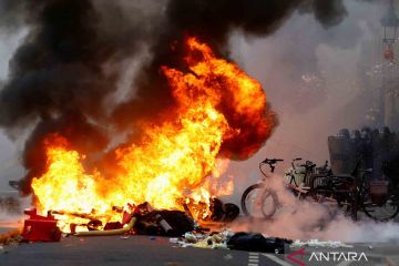 Pengunjuk rasa membakar tempat sampah dan barikade kepolisian saat berunjuk rasa memprotes penembakan kepada anggota Komunitas Kurdi di Kota Paris, Prancis, Sabtu (24/12/2022). Unjuk rasa yang terjadi menyusul tewasnya tiga orang anggota Komunitas Kurdi oleh orang tidak dikenal tersebut berakhir bentrokan pengunjuk rasa dengan aparat kepolisian. ANTARA FOTO/REUTERS/Sarah Meyssonnier/wsj.