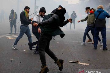 Pengunjuk rasa berunjuk rasa memprotes penembakan kepada anggota Komunitas Kurdi di Kota Paris, Prancis, Sabtu (24/12/2022). Unjuk rasa yang terjadi menyusul tewasnya tiga orang anggota Komunitas Kurdi oleh orang tidak dikenal tersebut berakhir bentrokan pengunjuk rasa dengan aparat kepolisian. ANTARA FOTO/REUTERS/Sarah Meyssonnier/wsj.
