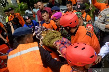 Tim SAR gabungan mengevakuasi jenazah korban banjir di Perumahan Antang, Makassar, Sulawesi Selatan, Minggu (25/12/2022). Seorang warga meninggal dunia akibat kecelakan saat rumahnya terendam banjir dan kini jenazahnya sudah diserahkan ke keluarga untuk dimakamkan. ANTARA FOTO/Abriawan Abhe/foc.