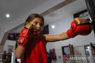 Seorang anak berlatih tinju di klub tinju wanita, Gaza City, Jumat (23/12/2022). ANTARA FOTO/Xinhua/Rizek Abdeljawad/rwa.