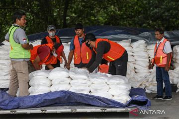 Sejumlah petugas menata garam yang akan dibawa pesawat Cassa A-2104 untuk persemaian garam dengan Teknologi Modifikasi Cuaca (TMC) di Skadron Udara 2, Halim Perdanakusuma, Jakarta, Rabu (28/12/2022). Pemerintah Provinsi DKI Jakarta bekerja sama dengan TNI Angkatan Udara (TNI AU), Badan Nasional Penanggulangan Bencana (BNPB), BMKG dan Badan Riset dan Inovasi Nasional (BRIN) melaksanakan Teknologi Modifikasi Cuaca (TMC) dengan menyiapkan 30 ton garam untuk persemaian dari tanggal 25 Desember 2022 - 3 Januari 2023 untuk mengantisipasi cuaca ekstrem. ANTARA FOTO/Asprilla Dwi Adha/aww.