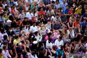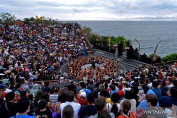 Wisatawan menyaksikan penampilan penari yang menampilkan atraksi wisata Tari Kecak Uluwatu di kawasan Uluwatu, Badung, Bali, Rabu (28/12/2022). Tari Kecak Uluwatu yang dipentaskan dalam dua sesi setiap harinya itu menjadi salah satu atraksi wisata yang ramai dikunjungi wisatawan liburan akhir tahun di Pulau Dewata. ANTARA FOTO/Fikri Yusuf/foc.