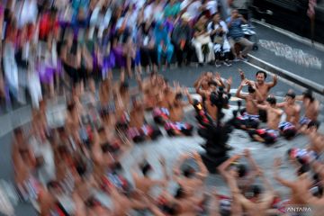 Penari berinteraksi dengan wisatawan yang menyaksikan atraksi wisata Tari Kecak Uluwatu di kawasan Uluwatu, Badung, Bali, Rabu (28/12/2022). Tari Kecak Uluwatu yang dipentaskan dalam dua sesi setiap harinya itu menjadi salah satu atraksi wisata yang ramai dikunjungi wisatawan liburan akhir tahun di Pulau Dewata. ANTARA FOTO/Fikri Yusuf/foc.