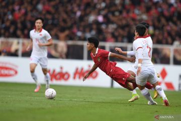 Pesepak bola timnas Indonesia Marselino Ferdinan (kanan) berebut bola dengan pesepak bola timnas Vietnam Nguyen Quang Hai (kiri) pada laga leg 1 semifinal Piala AFF 2022 di Stadion Utama Gelora Bung Karno (SUGBK), Jakarta, Jumat (6/1/2023). Pertandingan ini berakhir tanpa gol. ANTARA FOTO/Aditya Pradana Putra/hp.
