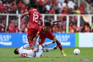 Pesepak bola timnas Indonesia Marselino Ferdinan Philipus (kanan) terjatuh seusai dilanggar dua pesepak bola timnas saat pertandingan leg 1 babak semifinal Piala AFF 2022 di Stadion Utama Gelora Bung Karno (SUGBK), Jakarta, Jumat (6/1/2023). Pertandingan ini berakhir tanpa gol. ANTARA FOTO/Akbar Nugroho Gumay/hp.