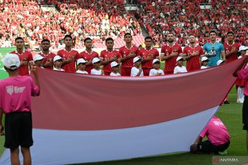 Pesepak bola timnas Indonesia menyanyikan lagu kebangsaan Indonesia Raya sebelum bertanding melawan timnas Vietnam pada laga leg 1 semifinal Piala AFF 2022 di Stadion Utama Gelora Bung Karno (SUGBK), Jakarta, Jumat (6/1/2023). Pertandingan ini berakhir tanpa gol. ANTARA FOTO/Aditya Pradana Putra/hp.