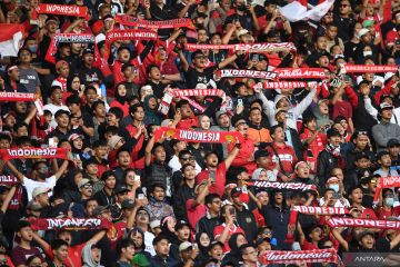 Suporter Timnas Indonesia memberikan dukungannya saat pertandingan leg 1 babak Semi Final Piala AFF 2022 melawan Vietnam di Stadion Utama gelora Bung Karno (SUGBK), Jakarta, Jumat (6/1/2023). Pertandingan ini berakhir tanpa gol. ANTARA FOTO/Akbar Nugroho Gumay/hp.