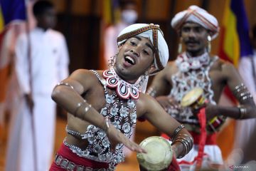 Sejumlah penari tampil dalam sebuah perayaan dalam rangkaian Festival Duruthu Perahera di sebuah kuil di Kelaniya, Sri Lanka, pada 5 Januari 2023. ANTARA FOTO/Xinhua-Ajith Perera/hp.