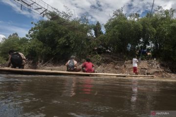 Sejumlah siswa menyeberangi sungai Ciujung menggunakan rakit di Desa Sukamekarsari, Lebak, Banten, Sabtu (7/1/2023). Rusaknya jembatan gantung yang berada di daerah tersebut mengakibatkan siswa terpaksa menyeberangi sungai dengan rakit untuk mempersingkat waktu dan jarak tempuh. ANTARA FOTO/Muhammad Bagus Khoirunas/foc.