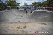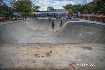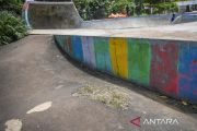 Kondisi lintasan skateboard yang berlubang di RTH Kalijodo, Penjaringan, Jakarta Utara, Sabtu (7/1/2023). Ruang Terbuka Hijau (RTH) Kalijodo yang biasa digunakan untuk rekreasi bagi warga Jakarta itu kini kondisinya terlihat kurang terawat. ANTARA FOTO/Galih Pradipta/pras.