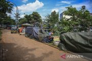Pekerja merapikan mainan anak-anak di RTH Kalijodo, Penjaringan, Jakarta Utara, Sabtu (7/1/2023). Ruang Terbuka Hijau (RTH) Kalijodo yang biasa digunakan untuk rekreasi bagi warga Jakarta itu kini kondisinya terlihat kurang terawat. ANTARA FOTO/Galih Pradipta/pras.