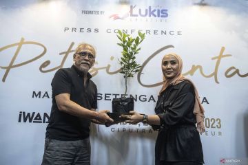 Penyanyi Virgiawan Liestanto alias Iwan Fals (kiri) menerima bibit tanaman dari CEO of Lukis Creative Dinar Adhyanti (kanan) dalam konferensi pers jelang konser tunggalnya di Kantor Lukis Creative, Kemang, Jakarta, Kamis (12/1/2023). Lukis Creative akan mengadakan konser tunggal dari penyanyi Iwan Fals bertajuk Petisi Cinta: Manusia Setengah Dewa pada 25 Februari 2023 di Ciputra Artpreneur Jakarta. ANTARA FOTO/Aprillio Akbar/hp.