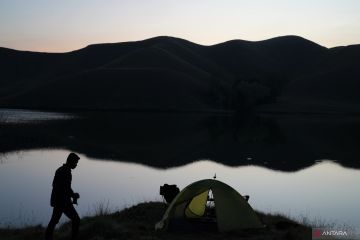 Sejumlah pengunjung mendirikan tenda di kaki Bukit Punggung Kuda di Desa Wumbubangka, Kecamatan Rarowatu Utara, Bombana, Sulawesi Tenggara, Sabtu (14/1/2023). Destinasi Bukit Punggung kuda yang baru ditemukan warga di daerah tersebut menyajikan keindahan danau yang dikelilingi bukit-bukit serta keindahan matahari yang terbit dari puncak bukit. ANTARA FOTO/Jojon/hp.