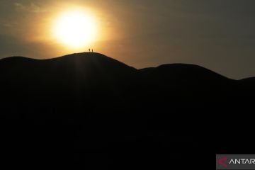 Dua pengunjung berada di puncak Bukit Punggung Kuda di Desa Wumbubangka, Kecamatan Rarowatu Utara, Bombana, Sulawesi Tenggara, Sabtu (14/1/2023). Destinasi Bukit Punggung kuda yang baru ditemukan warga di daerah tersebut menyajikan keindahan danau yang dikelilingi bukit-bukit serta keindahan matahari yang terbit dari puncak bukit. ANTARA FOTO/Jojon/hp.