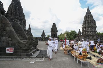 Pemuka umat Hindu memimpin sembahyang Hari Raya Kuningan di Kompleks Candi Prambanan, Sleman, DI Yogyakarta, Sabtu (14/1/2023). Sembahyang Hari Raya Kuningan yang diikuti ratusan umat Hindu tersebut baru pertama kali digelar di Candi Prambanan. ANTARA FOTO/Hendra Nurdiyansyah/foc.