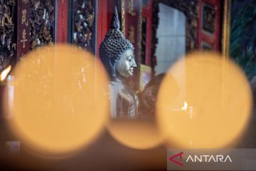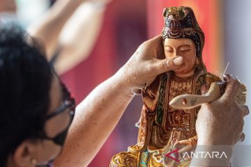 Warga keturunan Tionghoa membersihkan patung atau rupang dewa dan dewi di Klenteng Tri Dharma Chandra Nadi (Soei Goeat Kiang) Palembang, Sumatera Selatan, Minggu (15/1/2023). Tradisi tersebut dilakukan setiap tahun untuk menyambut perayaan Tahun Baru Imlek 2574 yang jatuh pada Minggu 22 Januari 2023 mendatang. ANTARA FOTO/Nova Wahyudi/pras.