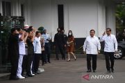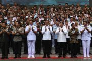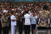 Sejumlah peserta Rapim Kemhan 2023 memberikan hormat kepada Presiden Joko Widodo (tengah) di Jakarta, Rabu (18/1/2023). Rapim Kemhan 2023 mengangkat tema Pertahanan Negara yang Kuat Mendukung dan Mengamankan Pembangunan Nasional. ANTARA FOTO/Akbar Nugroho Gumay/aww.