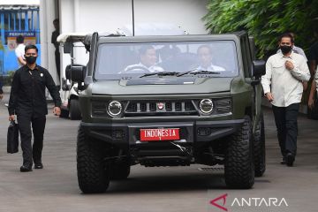 Presiden Joko Widodo (kanan) bersama Menhan Prabowo Subianto (kiri) menaiki mobil Maung buatan Pindad saat menghadiri Rapim Kemhan 2023 di Jakarta, Rabu (18/1/2023). Rapim Kemhan 2023 mengangkat tema Pertahanan Negara yang Kuat Mendukung dan Mengamankan Pembangunan Nasional. ANTARA FOTO/Akbar Nugroho Gumay/aww.